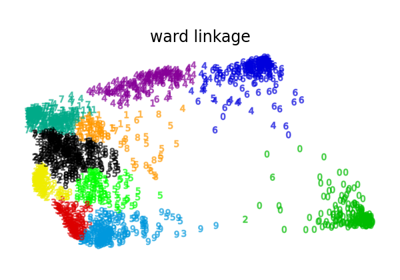 مختلف خوارزميات التجميع الهرمي على تضمين ثنائي الأبعاد لمجموعة بيانات الأرقام