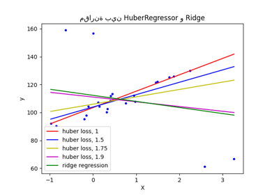 مقارنة بين HuberRegressor و Ridge على مجموعة بيانات تحتوي على قيم شاذة قوية