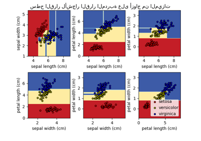 رسم سطح القرار لأشجار القرار المدربة على مجموعة بيانات الزهرة الآرغوانية